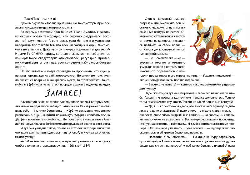 <p> Чего может не хватать современной курице, известной джазовой певице, живущей насыщенной культуркурной жизнью? </p> <p> Ну конечно же, времени! Вернее, умения с ним договариваться, чтобы перестать вечно опаздывать. Амалия постоянно гонится за ним — то на сигвее, то на гиппобусе, </p> <p> то на павлиолёте, а бывает, что и на подъёмном кране! И пока Амалия пытается ухватить время за хвост, её преследуют приключения. </p> <p> К счастью, есть верные друзья и восхищённые поклонники, которые всегда выручат звезду Лиссаслонска. </p> <p> А ещё Амалии не хватает полёта. Она мечтает парить высоко-высоко, но курицы не летают! Хотя... </p> <p> Ох-квох, ни слова больше! Амалия уже вскочила на мотороллер и мчится на концерт! Только бы опять не оп-оп-опоздать! </p>