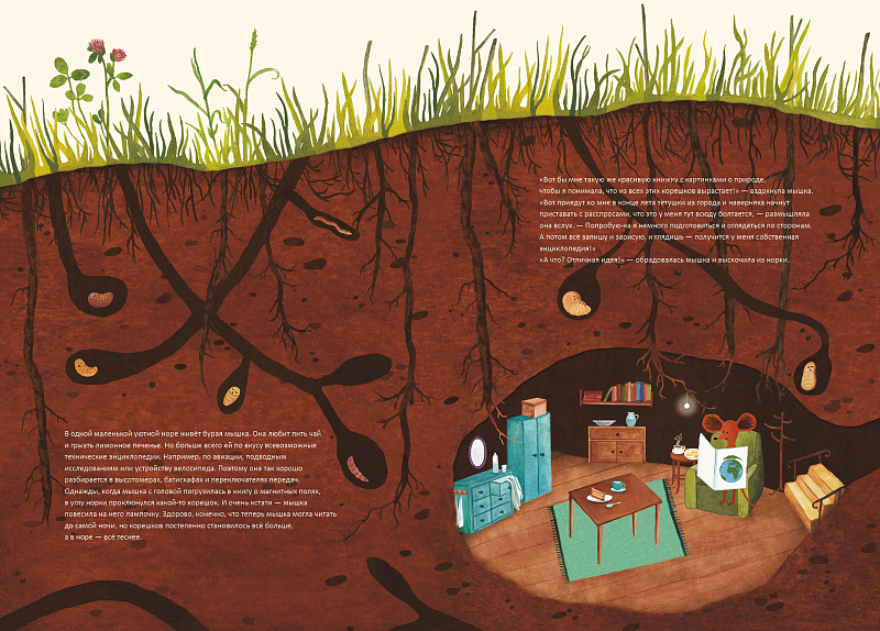 В маленькой уютной норе в лесу живёт Мышка. Больше всего на свете она любит энциклопедии. И вот однажды в голову ей приходит прекрасная идея: а почему бы не составить собственную энциклопедию о таком большом мире, который окружает уютную нору,— и о всей мелюзге, которая в нём живёт!