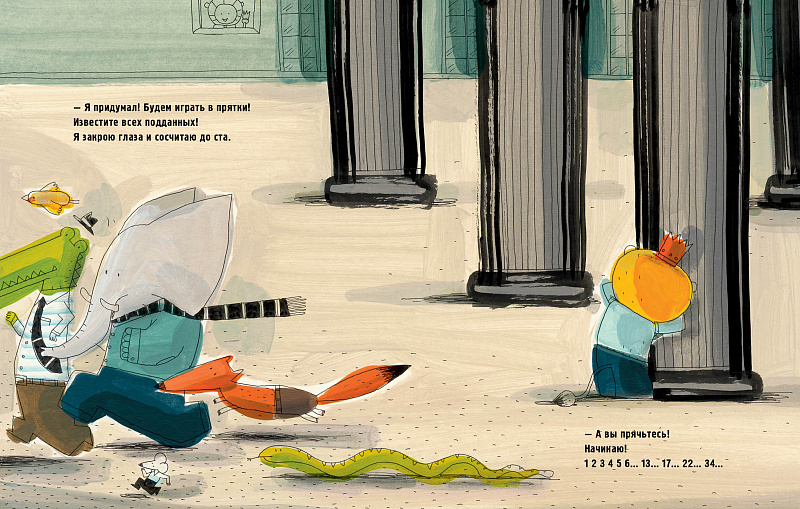 Царю зверей, маленькому львёнку, скучно. Чем бы себя занять? Придумал! Будем играть в прятки! Все-все звери спрячутся в разных уголках царства, а маленький львёнок с читателем попробуют их отыскать. Раз-два-три-четыре-пять, мы идём искать! Кто не спрятался — мы не виноваты! Молодцы! Всех-всех нашли! Хотя на самом деле нет...