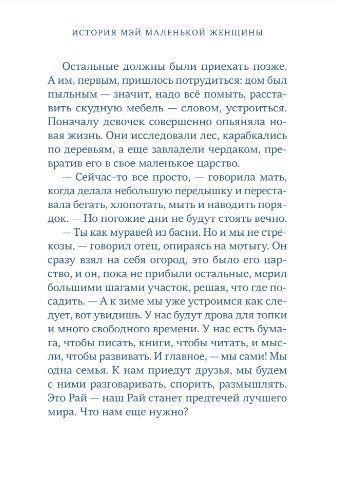 <p> Мэй еще ребенок, но она уже знает, каково это, когда все в твоей жизни вдруг поменялось. Ее семья переезжает из городка Конкорд в Рай — место, где родители Мэй хотят построить идеальную коммуну. Там не едят мяса, не эксплуатируют животных (даже пчел!) и носят самую простую одежду из льна. И хотя в новой жизни есть место и дружбе — с индейской девочкой по имени Две Луны, и первой влюбленности — в Прекрасного Господина, и приключениям, но все-таки эту новую жизнь Мэй не выбирала. И единственный способ принять перемены — это взять в руки бумагу и перо и воссоздать реальность вокруг себя — в письмах подруге Марте, оставшейся в городе. У Мэй невероятное воображение, и в своих письмах она будто живет в разных реальностях, переосмысливает свое прошлое и придумывает будущие, еще не испытанные приключения. И понимает, что, как и в природе, в жизни все меняется, и движение является неотъемлемой частью жизни. </p> <p> Действие книги происходит в Америке XIX века и основано на событиях ранних лет жизни Луизы Мэй Олкотт, всемирно известного автора «Маленьких женщин». </p> <p> </p> <p> <i><span style="color: #002056;"><b>Цитаты из книги:</b></span></i> </p> <p> «У нас будут дрова для топки и много свободного времени. У нас есть бумага, чтобы писать, книги, чтобы читать, и мысли, чтобы развивать. И главное, — мы сами! Мы одна семья. К нам приедут друзья, мы будем с ними разговаривать, спорить, размышлять. Это Рай — наш Рай станет предтечей лучшего мира. Что нам еще нужно?». </p> <p> «Правда, надо признаться, Бумажная Марта звучит не так красиво, как Мэй Маленькая Женщина. Маленькая Женщина с Пером в Руке, которая пишет и пишет, потому что вещи начинают существовать, когда ты их описываешь, — становятся явственнее, сильнее. Мэй Маленькая Женщина владычица Белой Бумаги. Но теперь довольно писем несуществующим подружкам. Лучше писать рассказы. Если правда каждому следует делать то, что у него хорошо получается — как это принято у индейцев, — тогда она волей-неволей должна писать. Выбора у нее нет». </p> <p> </p>