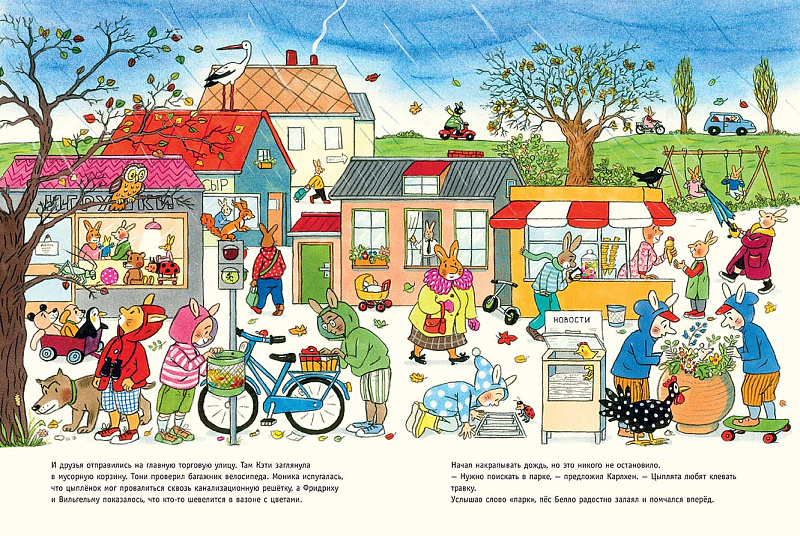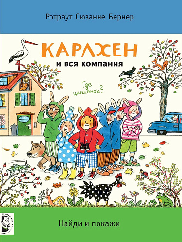 Однажды утром Карлхен собрался покормить цыплёнка, но его нигде не было. Интересно, куда подевался этот непоседа? Карлхен принимается искать. Постепенно к поискам присоединяются все друзья Карлхена: кузина Кэти, Моника и её пёс Белло, сосед Тони, близнецы Фридрих и Вильгельм. Вместе они ищут цыплёнка дома, в саду, на улице, в центре города, в парке и в лесу. В конце концов, цыплёнок находится самым неожиданным образом.<br> <br> После прочтения этой почти детективной истории маленьким читателям предлагается выполнить задания: найти на каждом развороте божью коровку, стрекозу, ворона, сову, белку, утку, кузнечика, улитку, мышь, аиста и лягушку. Кто-то из них встречается с самой первой страницы, а кто-то появляется чуть позже. А ещё на каждом развороте нужно найти цыплёнка. Да-да, Карлхен и его друзья просто не замечали маленького шалуна, который решил поиграть с ними в прятки, но внимательные читатели обязательно его отыщут.<br> <br> «Карлхен и вся компания» ̶ первый большой виммельбух в серии книг о зайчонке Карлхене. Он подойдёт как для первого знакомства с Карлхеном, его семьёй и друзьями, так и тем, кто уже успел прочитать другие книги об этих героях.<br> <ul> </ul>