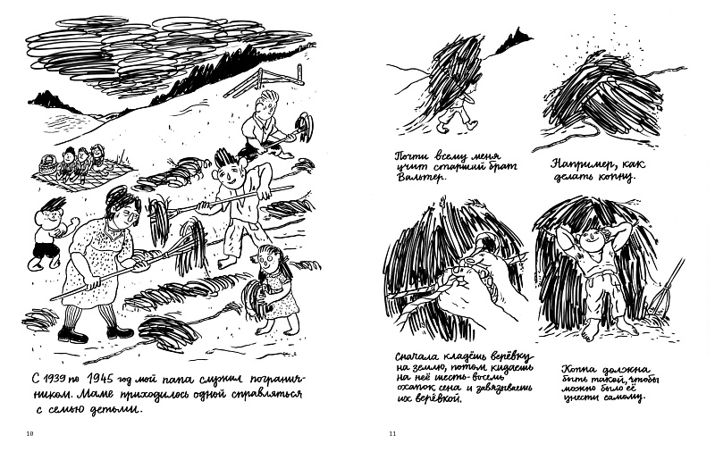 Тяготы сельскохозяйственных работ и неутомимость, с которой Эрнст справляется с полными тяжелейшего труда буднями, очерчены грубоватыми штрихами. Вкраплённые между ними пейзажи, напротив, нарисованы тонким пером и эффектно передают красоту и беспощадность природы, окружающей мальчика. В остальных эпизодах Нюссли прибегает к фантастическому, порой доходящему до сюрреализма стилю, благодаря которому некоторые особенно болезненные переживания главного героя походят на сцены из ночных кошмаров.