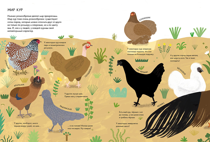 Эта книга — праздник многообразия! У куриц разные характеры и поведение, внутри только одной породы может быть десяток окрасов, а уж сколько пород во всем мире – около 300!