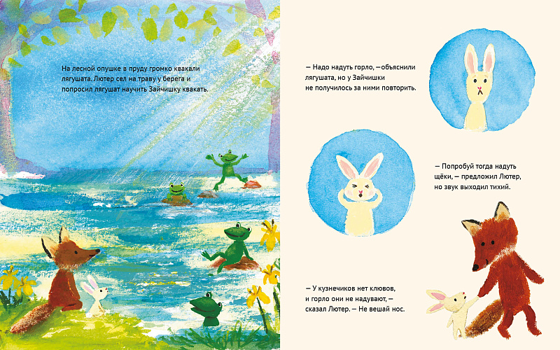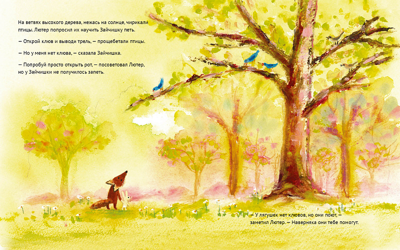 Наконец-то лето! Можно целый день лежать в тени деревьев и слушать, как щебечут птицы, квакают лягушки и стрекочут кузнечики. Но подождите, кто это плачет? Это Зайчишка, она расстроилась, потому что ничего не умеет: ни щебетать, ни квакать, ни стрекотать. Лисёнок Лютер уверен, что всему можно научиться. Вместе они устроят великолепное представление!
