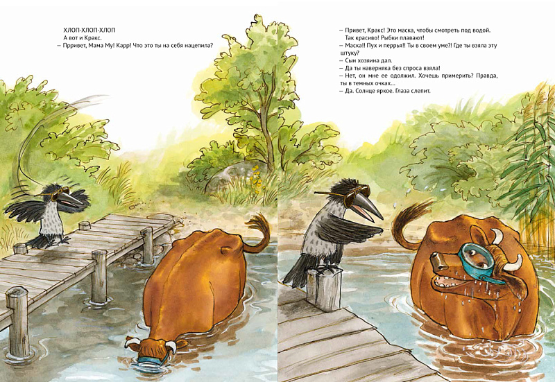 <p> Корова Мама Му неплохо проводит время: рассматривает подводный мир с помощью маски для плавания, которую она одолжила у сына хозяина. К ней прилетает ее закадычный друг — ворона Кракс. Но ему неинтересны все ее развлечения — ни маска, ни игрушечные кораблики. У Кракса более масштабные планы: он хочет построить настоящую гоночную лодку, чтобы носиться по воде с бешеной скоростью. Но во время запуска что-то идет не так, и Кракс взмывает в небо, а потом больно падает на землю. Корова утешает его: в следующий раз он сможет получше рассчитать свои силы, и тогда ему не придется считать синяки и шишки. </p> <ul> <li>Иллюстрации Свена Нурдквиста — автора книг про Петсона и Финдуса.</li> <li>Про дружбу умной коровы и взбалмошной вороны.</li> <li>Мама Му осваивает маску для плавания, а Кракс строит гоночную лодку.</li> </ul> <ul> </ul> <p> <b>Для кого:</b> </p> <p> Для чтения взрослыми детям в возрасте от 3 лет. </p>