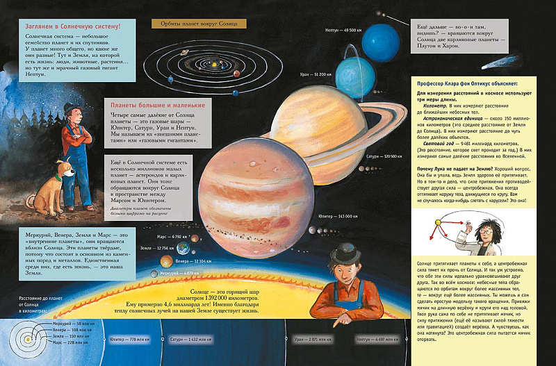 Поздними осенними вечерами Мулле Мек и его собака Буффа любят сидеть на веранде, смотреть на небо и размышлять обо всём, что есть в космосе. А там есть и звёзды, и планеты, есть кометы, галактики и даже чёрные дыры! У Буффы, конечно, много вопросов. С чего всё началось? Как появилась Вселенная? Что такое Солнечная система? Откуда берутся кометы и метеориты? Мулле Мек по порядку ей всё объясняет, а профессор астрономии Клара фон Оптикус дополняет его слова интересными научными фактами.