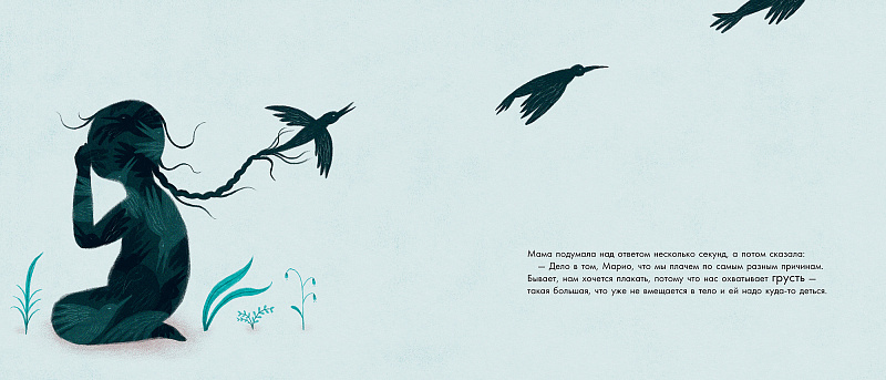 Мало кто знает, но я также большая собирательница страхов. У меня есть красный страх, яркий, как свежая кровь; есть другой — огромный, тёмный и вязкий; есть у меня и страх крохотный, как зёрнышко риса; и даже страх, который умеет свистеть. Один раз меня посетил страх, как две капли воды похожий на меня, только с огромными глазами. А ещё у меня был страх в форме чёрного яйца, тяжёлого и хрупкого, похожего на то, которое я нарисовала для этой истории.