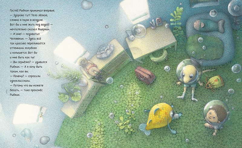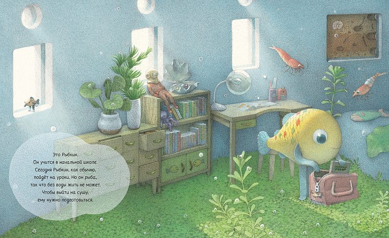Рыбкин живёт в воде, но ходит в школу с другими ребятами. Каждый день он надевает костюм с тяжёлым стеклянным шлемом. На физкультуре ему труднее всех, Рыбкин её терпеть не может.