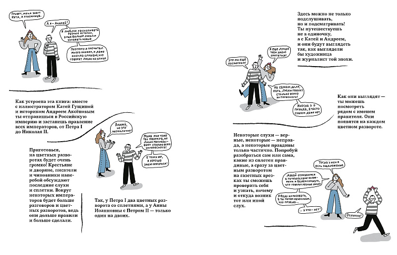 У иллюстратора Кати Гущиной и историка Андрея Аксёнова есть преимущество перед нашими предками — дистанция от той словесной суеты, которая позволяет спокойно восстановить историю, подтвердить или опровергнуть слухи о российских императорах от Петра I до Николая II.