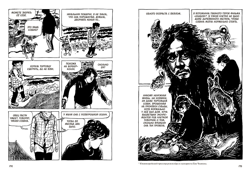 В «Собаках» Ким-Жандри Кымсук разоблачает жестокость своих, казалось бы, цивилизованных соотечественников, выступает против насилия над животными и показывает волшебство, которое происходит, когда собака растёт в любящей и заботливой семье.