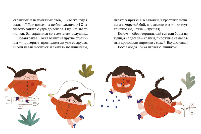 Точка живёт в тетради в линейку, и хочет, когда вырастет, стать точкой над «i». Ну а пока что она любит кувыркаться, висеть вниз головой на верхней линейке и играть с весёлой кудлатой Ошибкой, которая забрела когда-то на их страницу. Но вот однажды Ошибка исчезла. И чтобы отыскать любимую подружку, Точке пришлось отправиться в неведомое — за пределы родной тетради. Этот остроумный рассказ о силе дружбы —удачный писательский дебют польской переводчицы и редактора Анны Тараски. Полная иронии, словесных игр и заданий книга отлично подходит для тех, кто только начинает читать и очень остроумно рассказывает о правилах правописания и речи через истории о жизни знаков препинания.